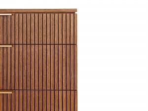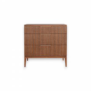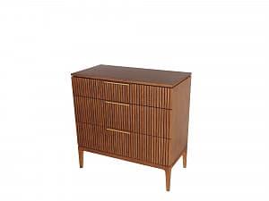 Фасады из реек придают поверхности ритм и глубину, создавая эффект лёгкой тени и движения при каждом изменении освещения. Этот визуальный рельеф сочетается с выразительной текстурой дуба — натурального, с глубокими тёмными прожилками и мягким, естественным блеском. Материалы подчеркивают серьёзность подхода: массив и шпон дуба — основа коллекции, а акцентные ручки из натуральной латуни добавляют благородства и тактильной ценности.