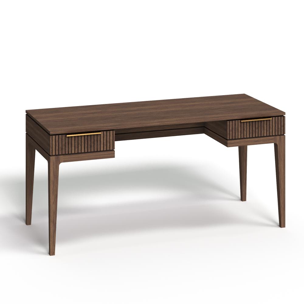 Фасады из реек придают поверхности ритм и глубину, создавая эффект лёгкой тени и движения при каждом изменении освещения. Этот визуальный рельеф сочетается с выразительной текстурой дуба — натурального, с глубокими тёмными прожилками и мягким, естественным блеском. Материалы подчеркивают серьёзность подхода: массив и шпон дуба — основа коллекции, а акцентные ручки из натуральной латуни добавляют благородства и тактильной ценности.