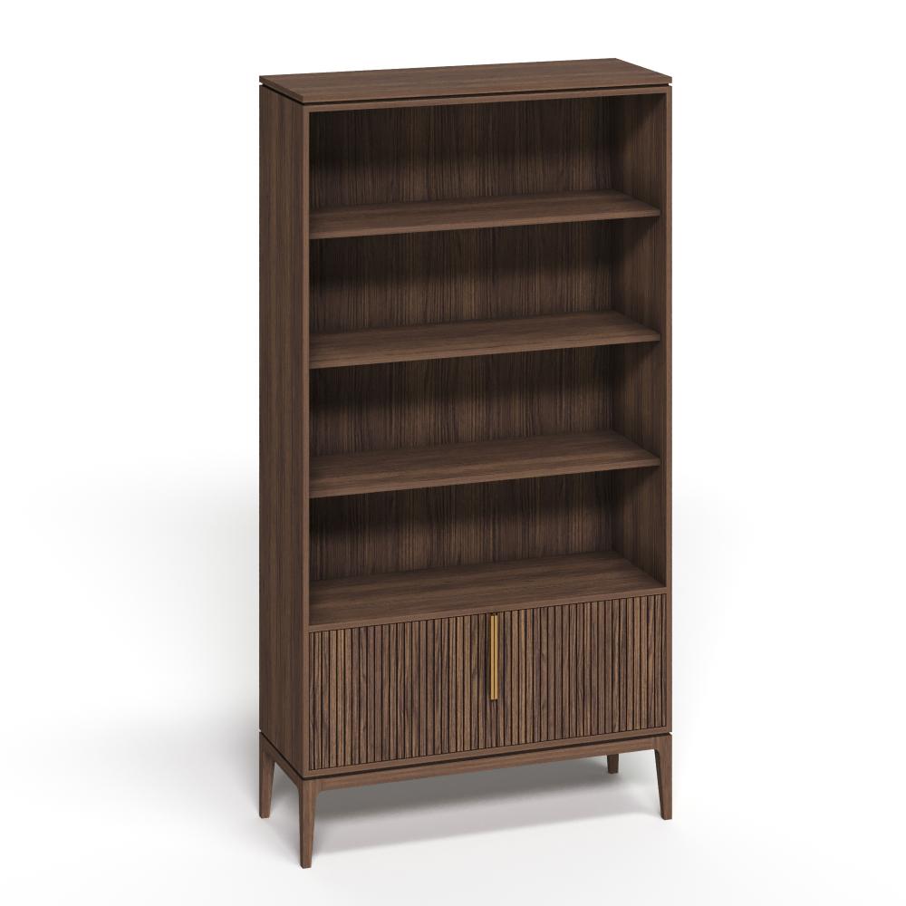 Фасады из реек придают поверхности ритм и глубину, создавая эффект лёгкой тени и движения при каждом изменении освещения. Этот визуальный рельеф сочетается с выразительной текстурой дуба — натурального, с глубокими тёмными прожилками и мягким, естественным блеском. Материалы подчеркивают серьёзность подхода: массив и шпон дуба — основа коллекции, а акцентные ручки из натуральной латуни добавляют благородства и тактильной ценности