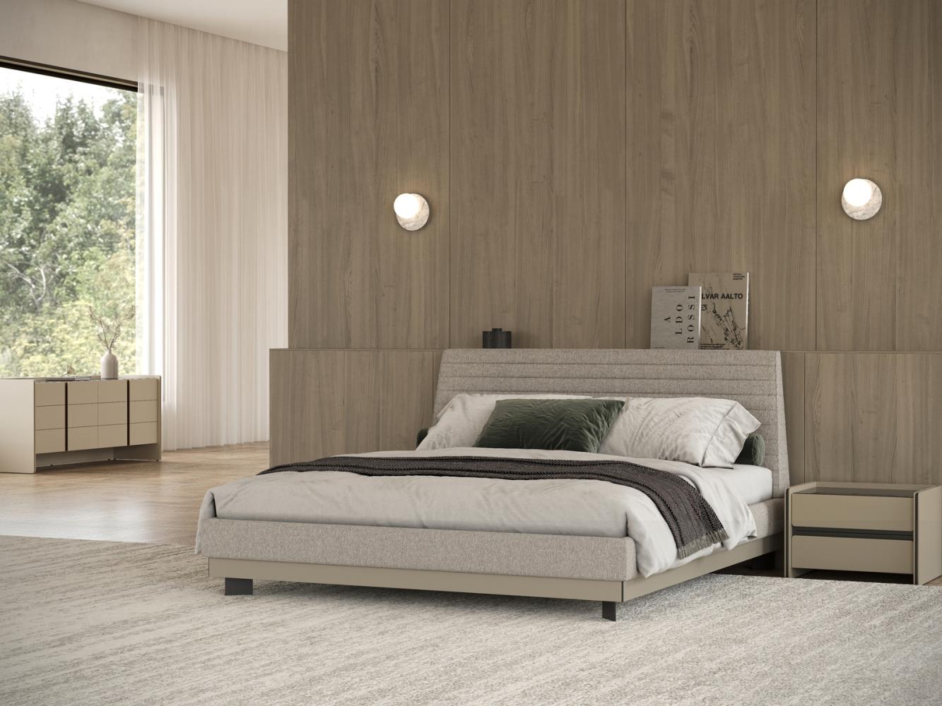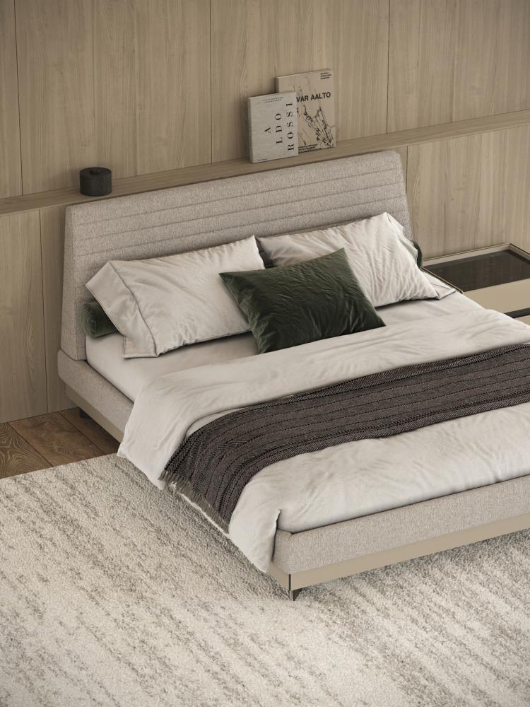 В этой модели сошлись два настроения: мягкость и точная геометрия. Широкое изголовье с горизонтальной простёжкой делает композицию более графичной и визуально вытягивает пространство, а лёгкий наклон и объёмный наполнитель дарят комфортную опору — для чтения, отдыха, тишины.