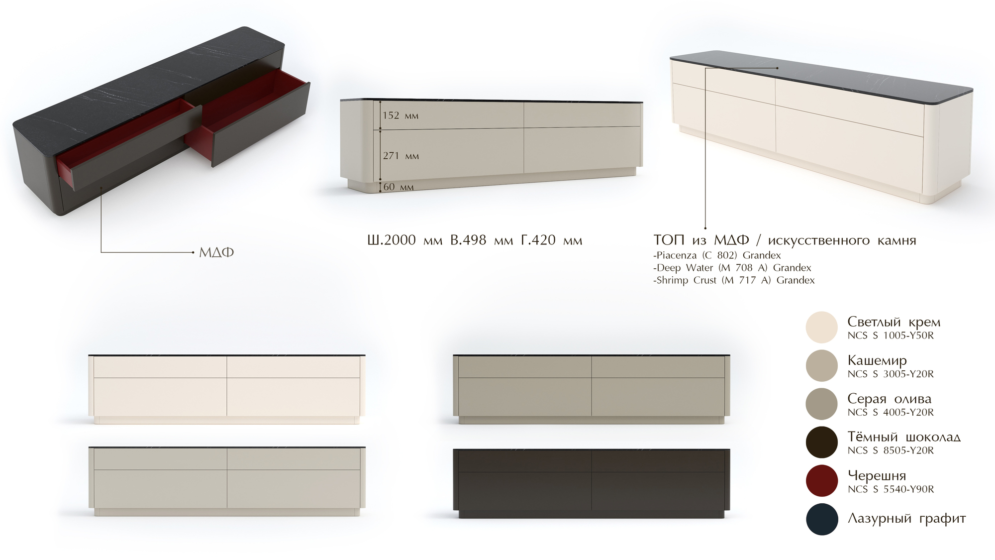 Fancy - это современная и стильная коллекция малых форм для спальни и гостиной. Благодаря скругленным боковинам создается гармония и уют в вашей комнате. На выбор несколько базовых цветов эмали, либо можно подобрать любой другой цвет по RAL или NCS каталогу. 2 варианта топа (эмаль или искусственный камень).