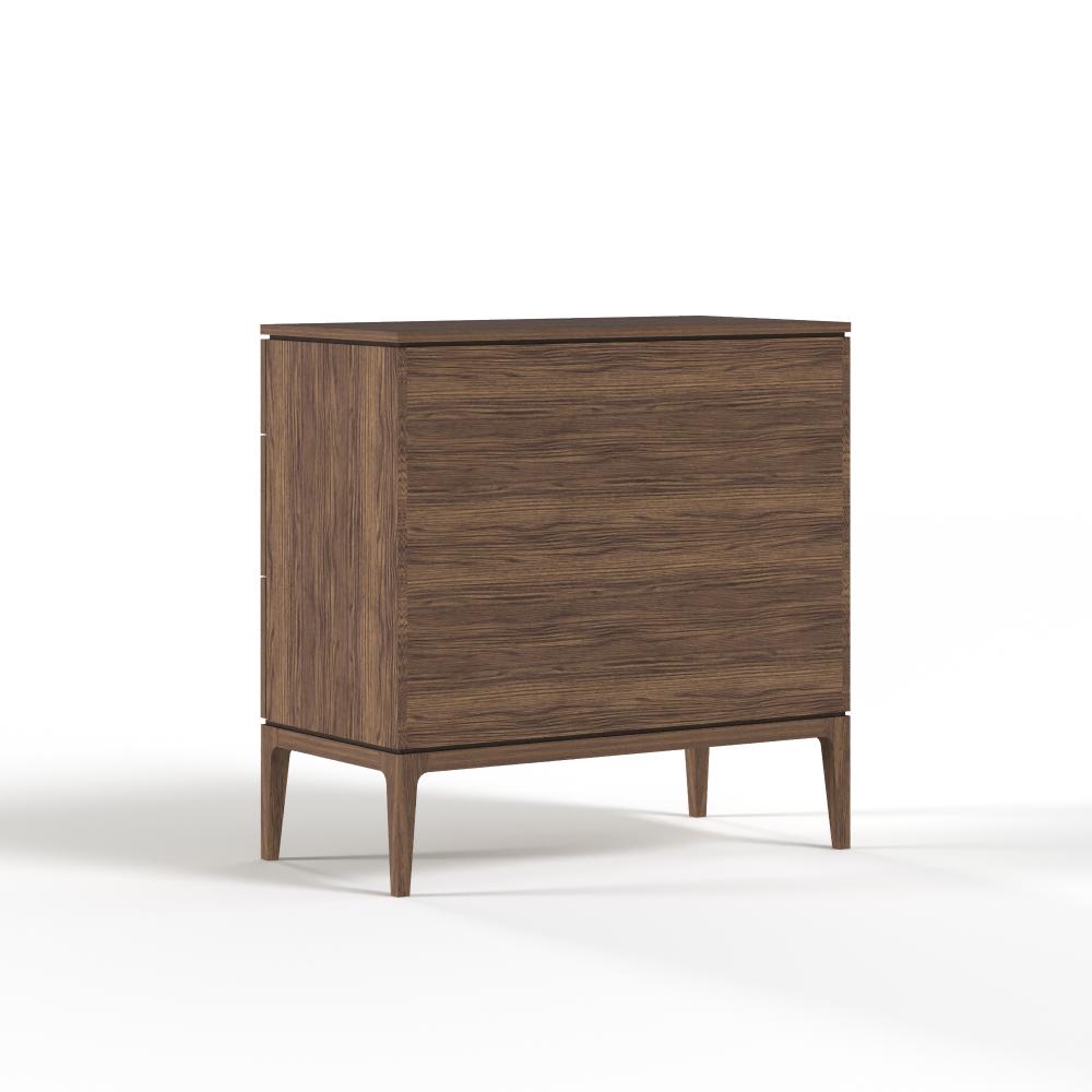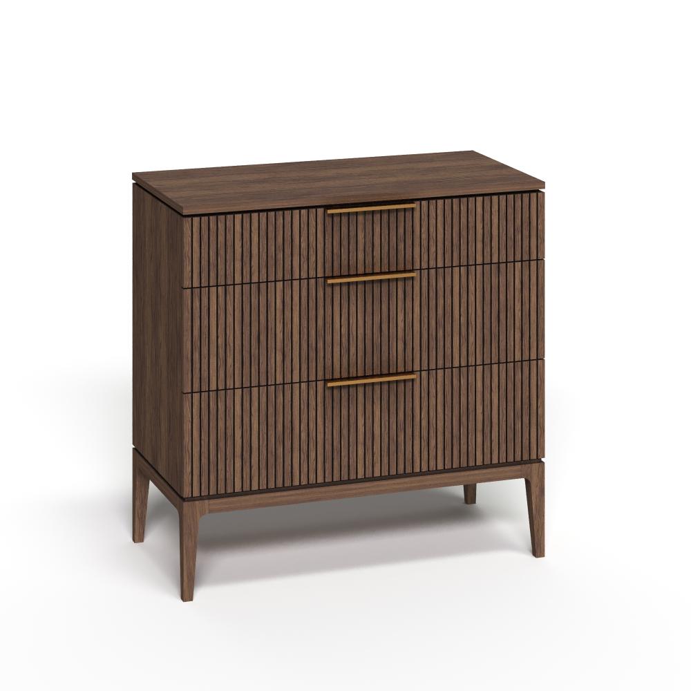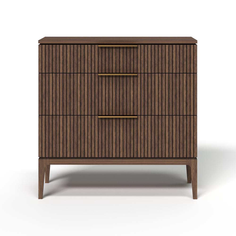 Фасады из реек придают поверхности ритм и глубину, создавая эффект лёгкой тени и движения при каждом изменении освещения. Этот визуальный рельеф сочетается с выразительной текстурой дуба — натурального, с глубокими тёмными прожилками и мягким, естественным блеском. Материалы подчеркивают серьёзность подхода: массив и шпон дуба — основа коллекции, а акцентные ручки из натуральной латуни добавляют благородства и тактильной ценности.