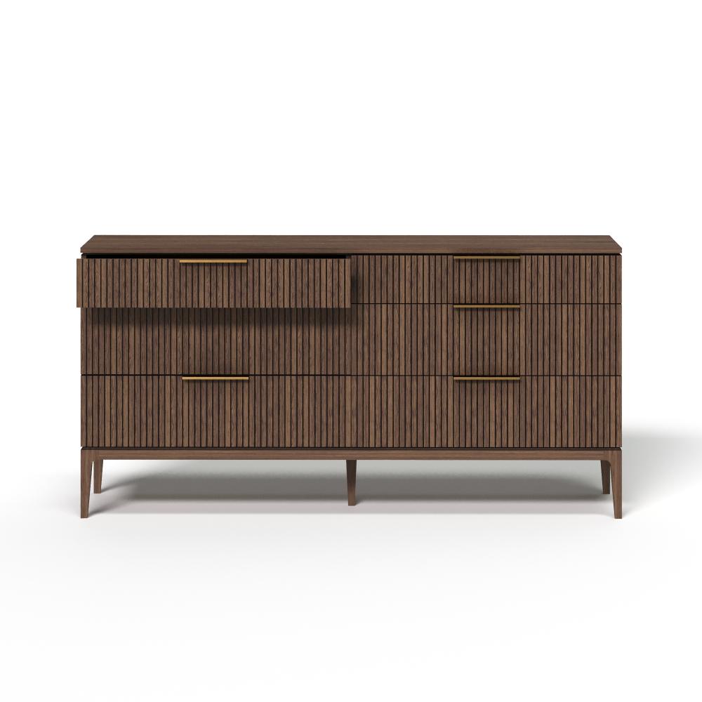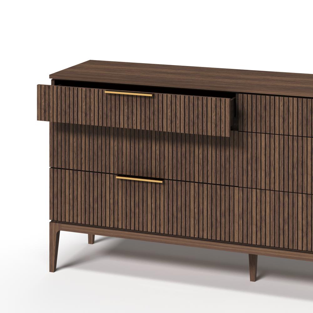 Фасады из реек придают поверхности ритм и глубину, создавая эффект лёгкой тени и движения при каждом изменении освещения. Этот визуальный рельеф сочетается с выразительной текстурой дуба — натурального, с глубокими тёмными прожилками и мягким, естественным блеском. Материалы подчеркивают серьёзность подхода: массив и шпон дуба — основа коллекции, а акцентные ручки из натуральной латуни добавляют благородства и тактильной ценности.