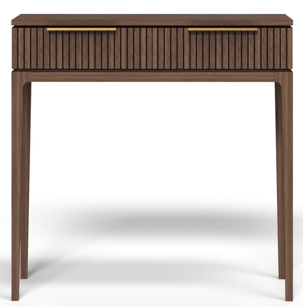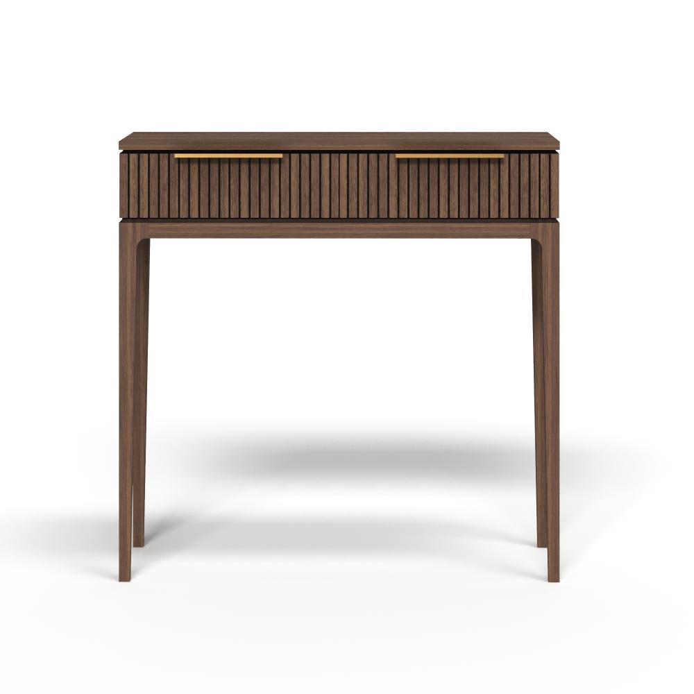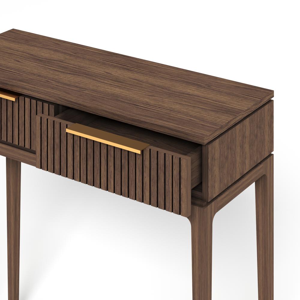 Фасады из реек придают поверхности ритм и глубину, создавая эффект лёгкой тени и движения при каждом изменении освещения. Этот визуальный рельеф сочетается с выразительной текстурой дуба — натурального, с глубокими тёмными прожилками и мягким, естественным блеском. Материалы подчеркивают серьёзность подхода: массив и шпон дуба — основа коллекции, а акцентные ручки из натуральной латуни добавляют благородства и тактильной ценности.
