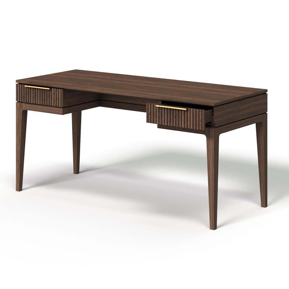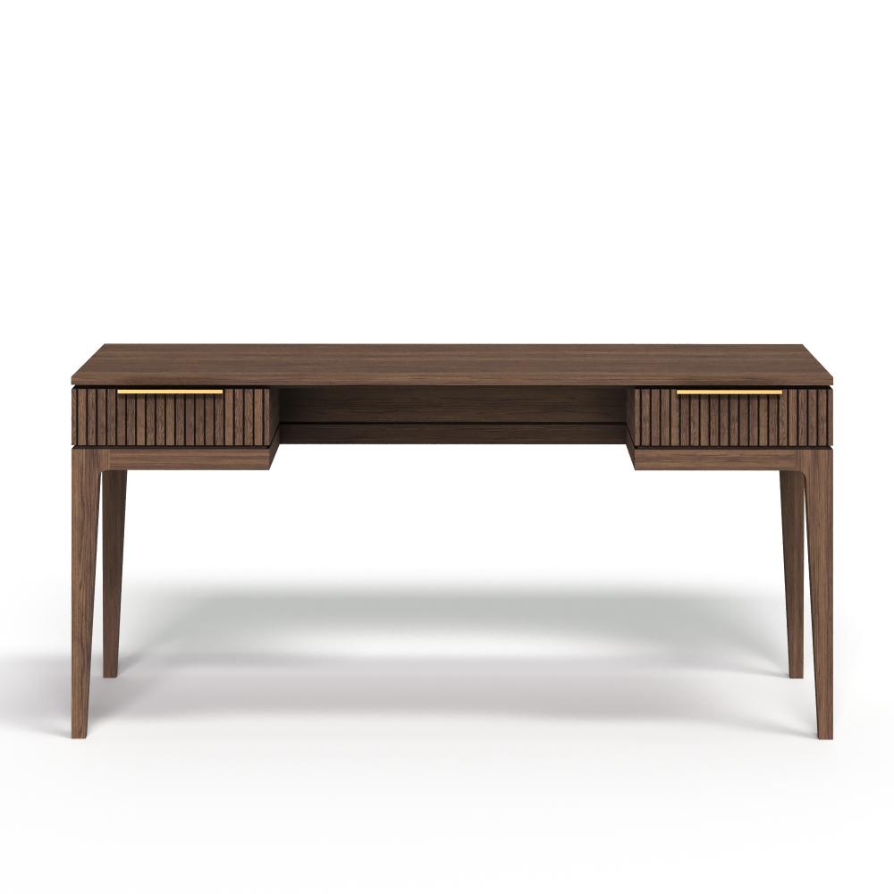 Фасады из реек придают поверхности ритм и глубину, создавая эффект лёгкой тени и движения при каждом изменении освещения. Этот визуальный рельеф сочетается с выразительной текстурой дуба — натурального, с глубокими тёмными прожилками и мягким, естественным блеском. Материалы подчеркивают серьёзность подхода: массив и шпон дуба — основа коллекции, а акцентные ручки из натуральной латуни добавляют благородства и тактильной ценности.