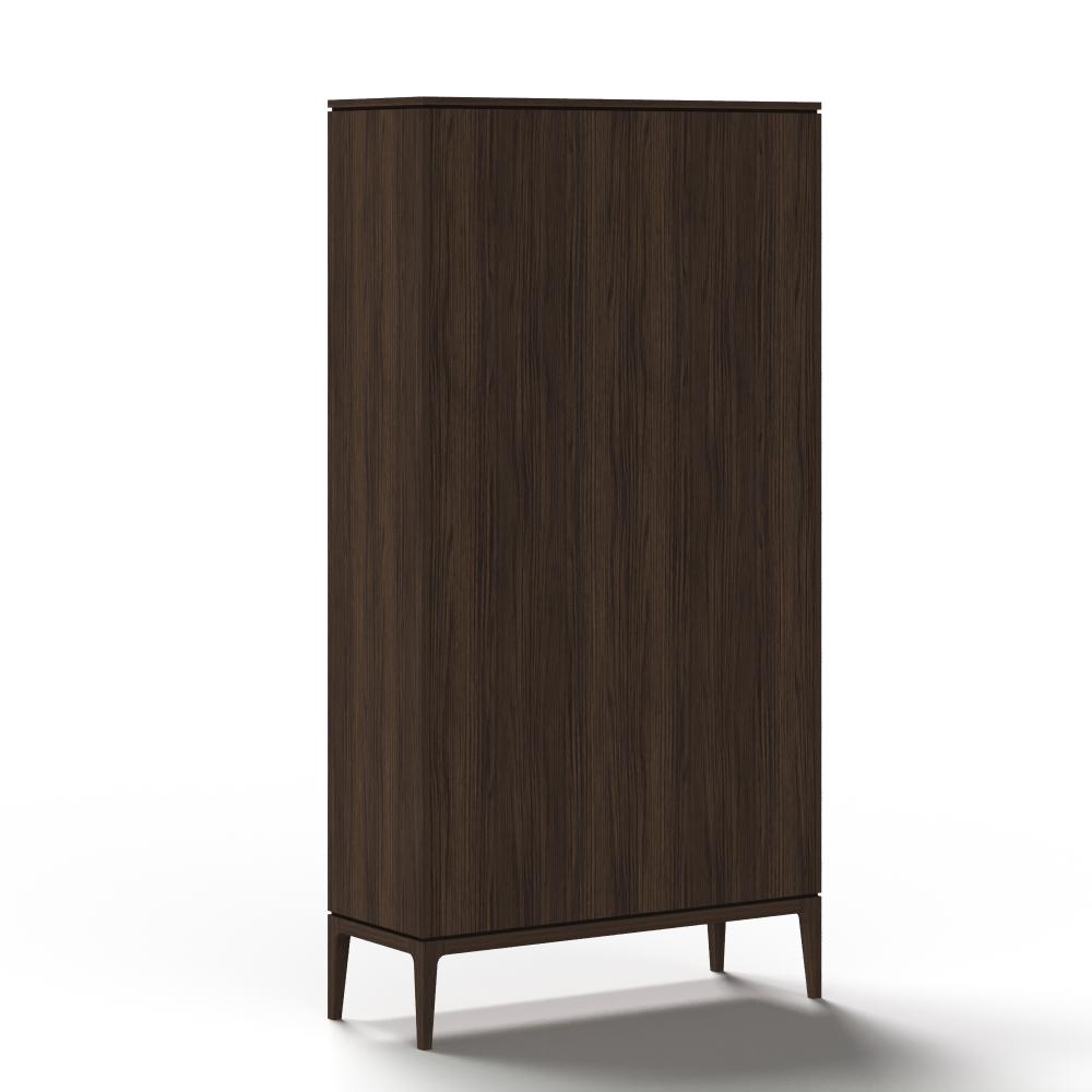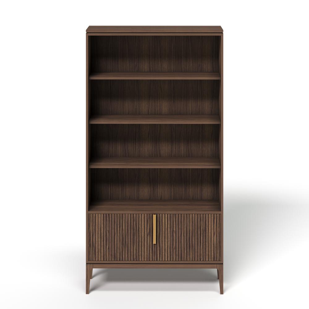 Фасады из реек придают поверхности ритм и глубину, создавая эффект лёгкой тени и движения при каждом изменении освещения. Этот визуальный рельеф сочетается с выразительной текстурой дуба — натурального, с глубокими тёмными прожилками и мягким, естественным блеском. Материалы подчеркивают серьёзность подхода: массив и шпон дуба — основа коллекции, а акцентные ручки из натуральной латуни добавляют благородства и тактильной ценности