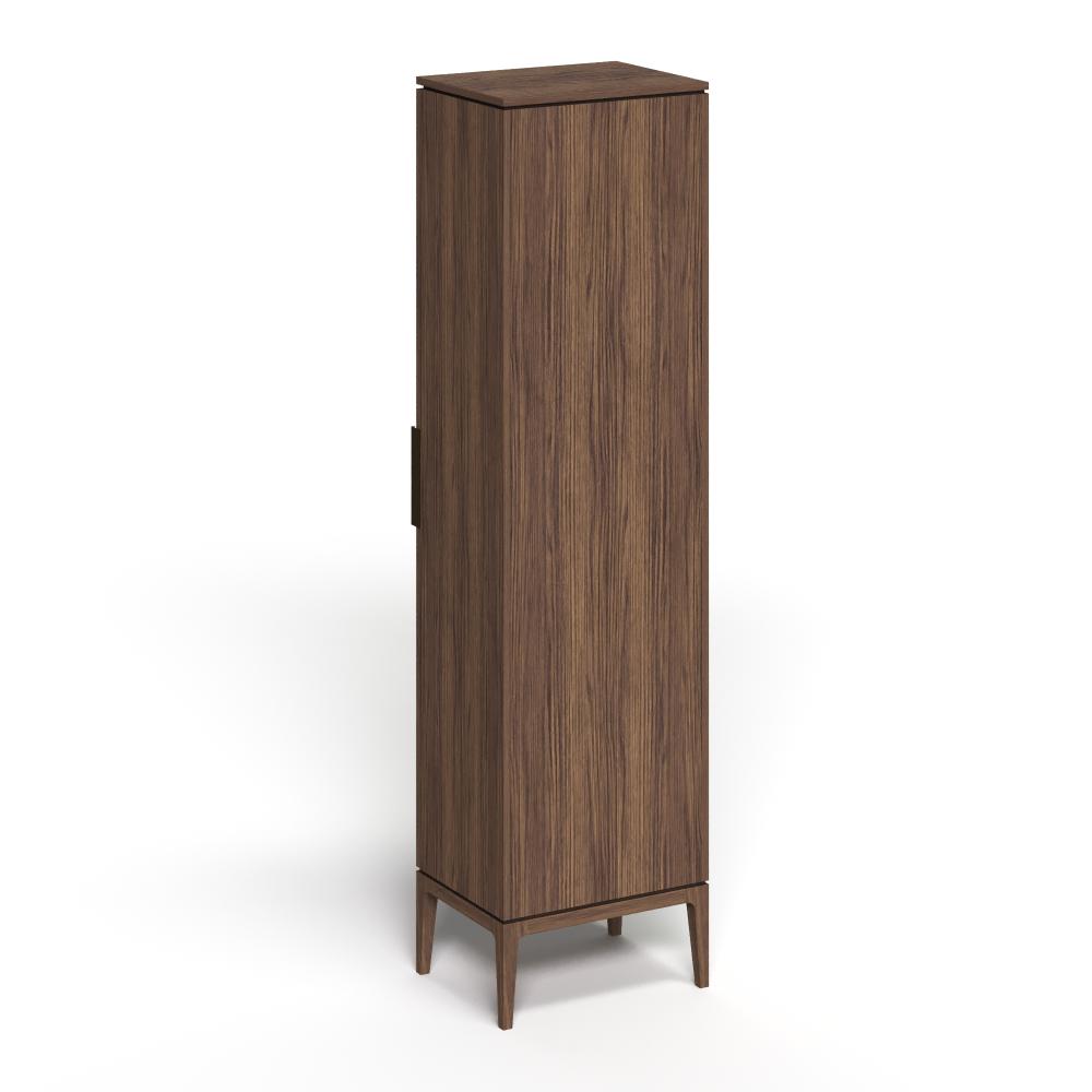 Фасады из реек придают поверхности ритм и глубину, создавая эффект лёгкой тени и движения при каждом изменении освещения. Этот визуальный рельеф сочетается с выразительной текстурой дуба — натурального, с глубокими тёмными прожилками и мягким, естественным блеском. Материалы подчеркивают серьёзность подхода: массив и шпон дуба — основа коллекции, а акцентные ручки из натуральной латуни добавляют благородства и тактильной ценности.