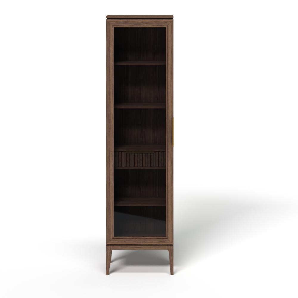Фасады из реек придают поверхности ритм и глубину, создавая эффект лёгкой тени и движения при каждом изменении освещения. Этот визуальный рельеф сочетается с выразительной текстурой дуба — натурального, с глубокими тёмными прожилками и мягким, естественным блеском. Материалы подчеркивают серьёзность подхода: массив и шпон дуба — основа коллекции, а акцентные ручки из натуральной латуни добавляют благородства и тактильной ценности.